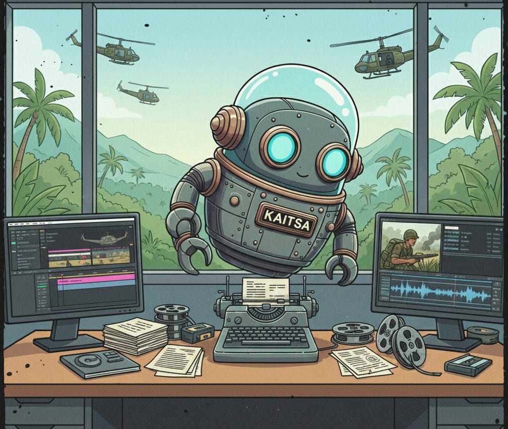 Note on Aesthetic Versatility: > "While this specific investigation adopts a Gonzo-inspired visual style to match the raw, underground tone of the Vietnam archives, the KAITSA Engine is stylistically agnostic. Had this been a New Yorker-style long-read, the AI Art Direction would have pivoted instantly toward minimalist watercolors or architectural 'Ligne Claire' illustrations. The technology doesn't dictate the aesthetic; it executes the Editor's vision with chameleon-like precision."